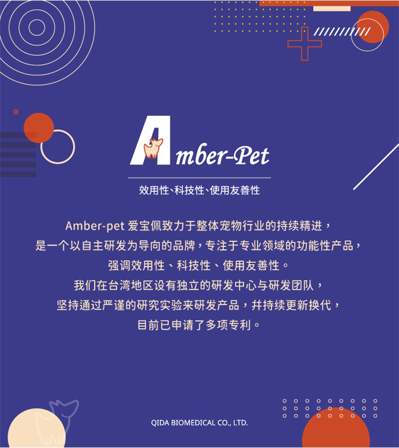 Amber-pet 爱宝佩致力于整体宠物行业的持续精进,是一个以自主研发为导向的品牌:专注于专业领域的功能性产品,强调效用性、科技性、使用友善性。我们在台湾地区设有独立的研发中心与研发团队,坚持通过严谨的研究实验来研发产品,并持续更新换代,目前已申请了多项专利。